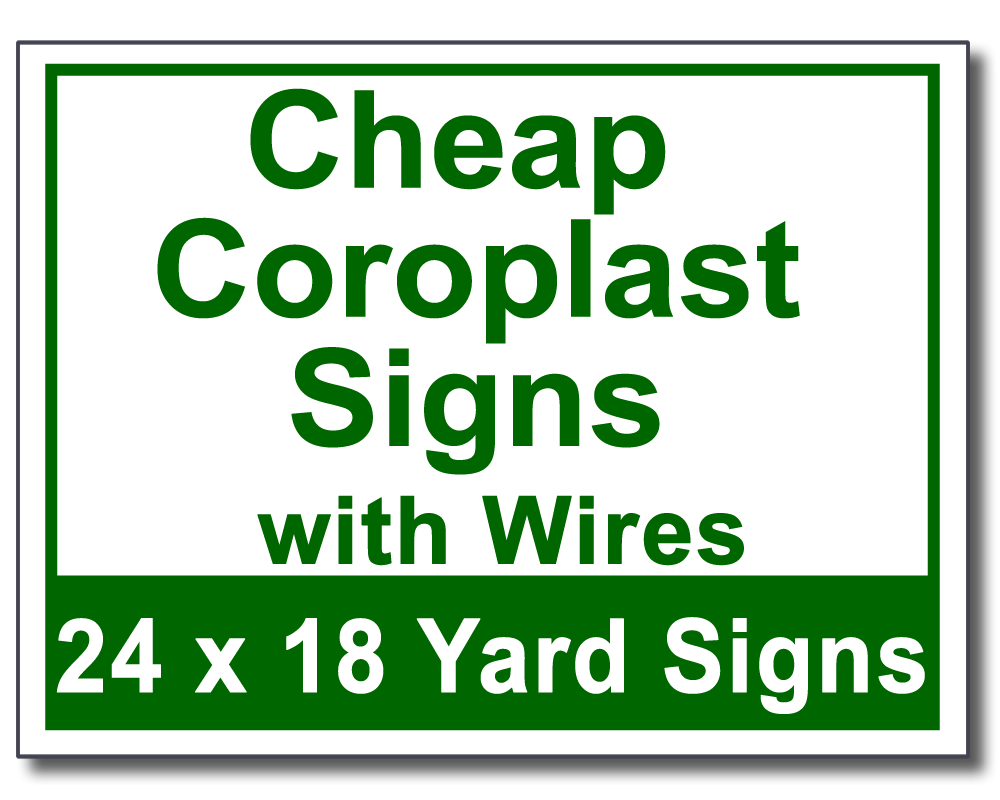 Cheap Coroplast Signs with Wires. Free Wires included. Kit Includes 50 24x18 Cheap Coroplast Signs with 100 Wires. Easy to order kits - customize with your contact information. This sign can be screen printed in any of our standard colors on white or yellow corrugated plastic.
