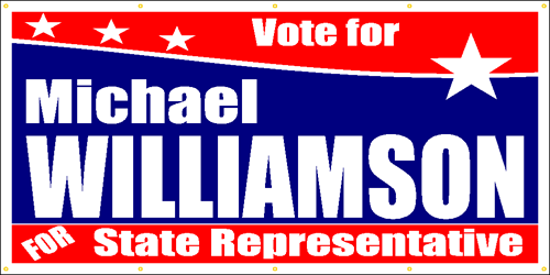 Election Campaign Banner Sign - Design P207. Grommets included. Design P207 features star theme yard sign design that you can make a banner out of the design. Banner signs can be another way of getting your name out. These political campaign banners work great at political rallies, local parades, campaign events, or even at polling locations.