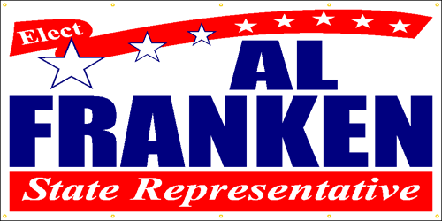Banners are made from a 13-ounce outdoor scrim vinyl. This is a sturdy banner that will outlast tough weather conditions. Political campaign banners do not necessarily have to be hung inside your building. Grommets are placed every 1½ to 3½ feet on the top and bottom depending on the size of your banner. Ideas for campaign slogans can be viewed on our political slogan ideas page. Pricing starts with a 2ft x 3ft and goes up from there.