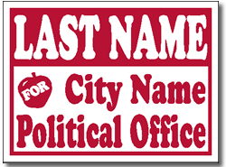 Political Yard Sign Design PSSW9 - One Click Kit. Sign wires included. 24x18 yard signs and sign frames. Easy to order kits - customize with your campaign information. School board campaign sign featuring an apple graphic and candidates name reverse printed at the top of sign.