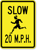 Slow 20 MPH Sign - Available in two reflective levels to satisfy most Local, State and Federal D.O.T. specifications. Size: 18 inches x 24 inches. Color: Black copy on Yellow field (RA Type I). Legend: SLOW 20 M.P.H. with Symbol.