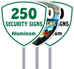 Aluminum Security Yard Sign Shield Design. Security signs are made of a durable 0.040'' white aluminum that won't rust in harsh winter environments. Shield shape. Sold 250 per box. Stakes sold separately.