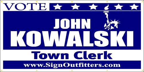 Banners are made from a 13-ounce outdoor scrim vinyl. This is a sturdy banner that will outlast tough weather conditions. Political campaign banners do not necessarily have to be hung inside your building. Grommets are placed every 1½ to 3½ feet on the top and bottom depending on the size of your banner. Ideas for campaign slogans can be viewed on our political slogan ideas page.